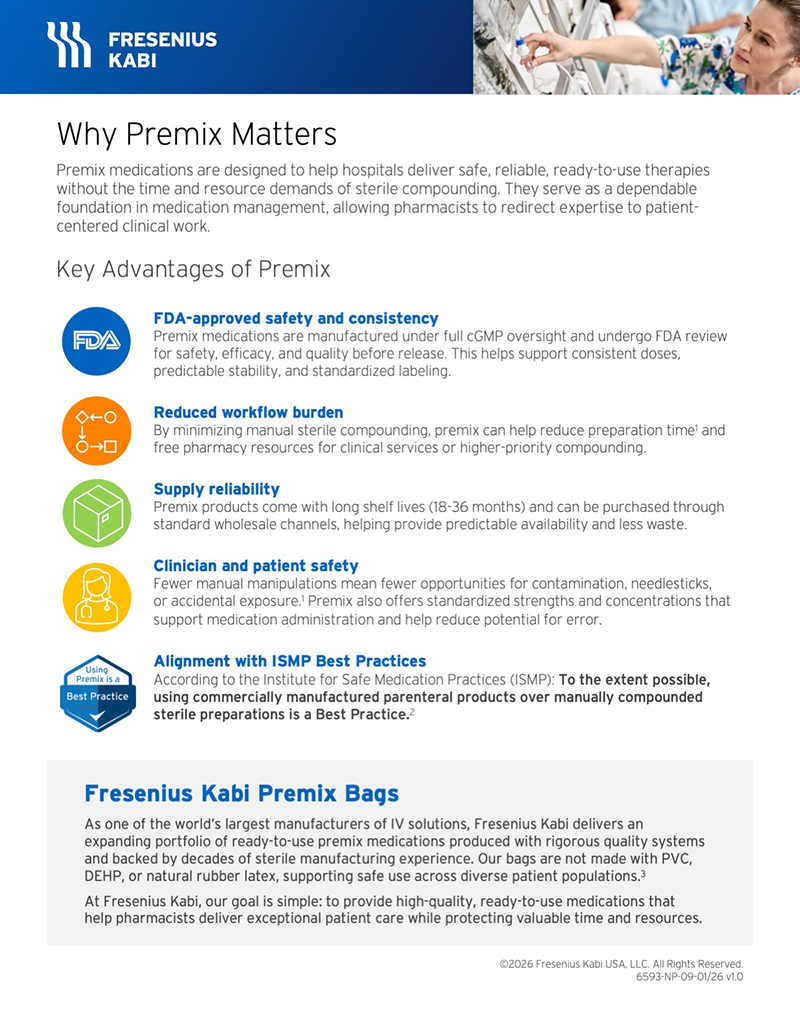 Compounding remains a critical pharmacy function. Premix enhances this capability by offering predictable, ready-to-use, FDA‑approved medications that help support operational efficiency, patient safety, and adherence to best practices.